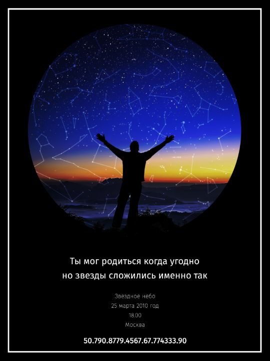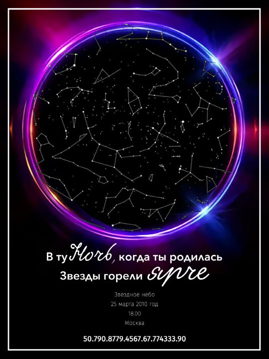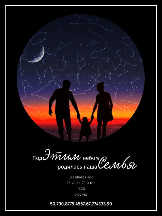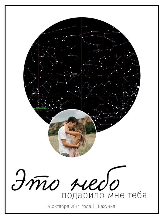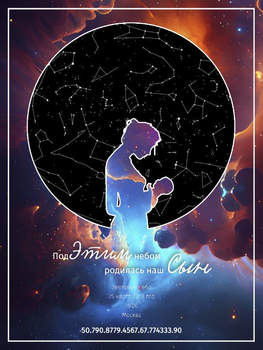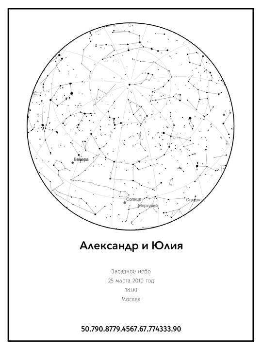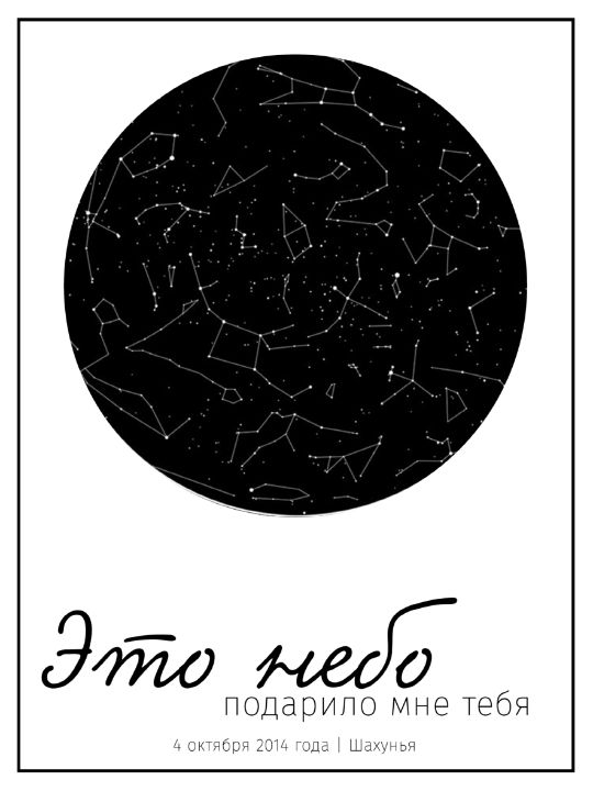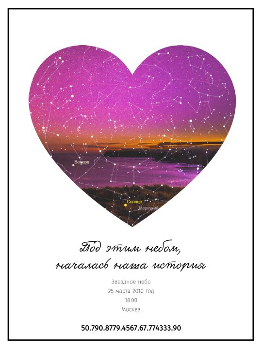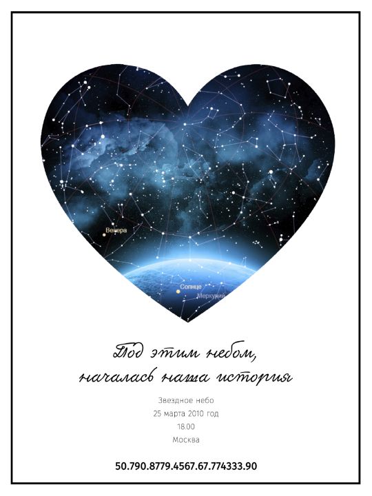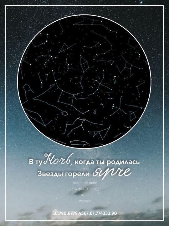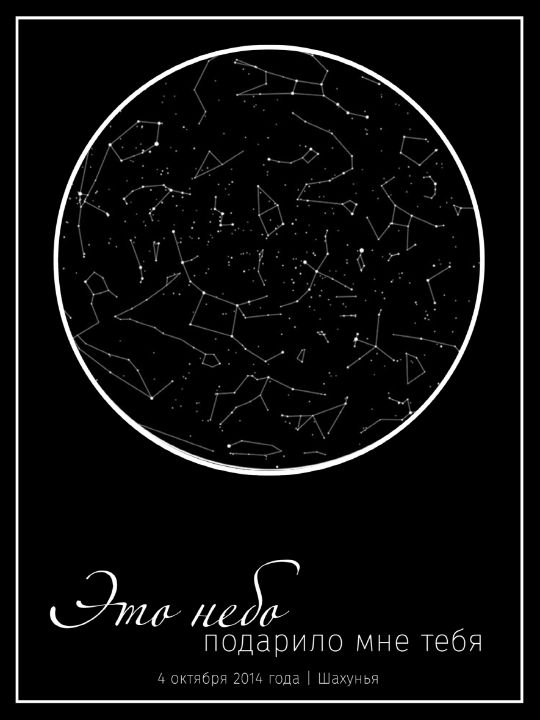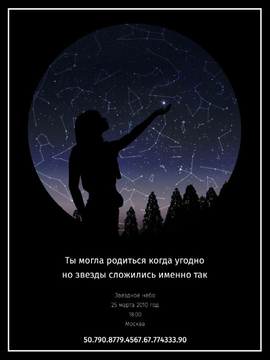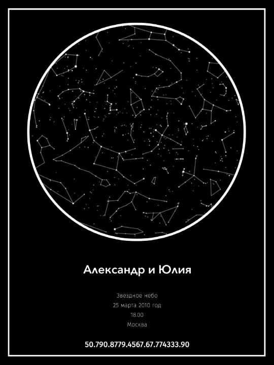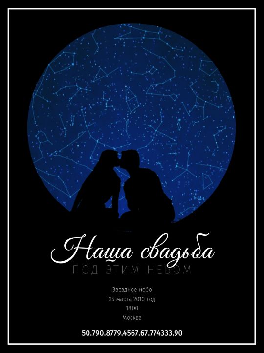 Звездное небо на картине - не просто случайное, это именно то расположение звезд, которое было видно в определенный момент времени в определенном месте. И это ваше место и ваше время, которое хранит чувства и эмоции важного для вас события